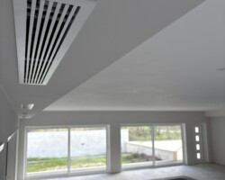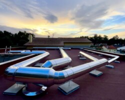Uma vez que o cliente já tinha a obra em andamento quando nos contactou, foi decidido instalar as condutas pela cobertura, garantindo isolamento térmico e proteção mecânica em todas as linhas.